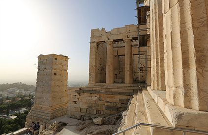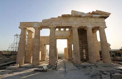 Пропилеи — монументальный вход на Акрополь, построенный в 437-432 гг. до н.э. по проекту архитектора Мнесикла. Это не просто ворота, а тщательно спланированная "вступительная часть" всего ансамбля, задающая тон всему посещению священного холма.