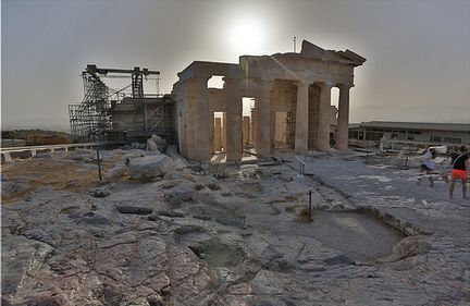 Храм Ники Аптерос (Бескрылой Победы) — изящный ионический храм, посвящённый богине победы Нике. Построен около 420 г. до н.э. на выступе скалы. Интересно, что статуя Ники внутри храма была без крыльев — чтобы победа никогда не улетела из Афин.
